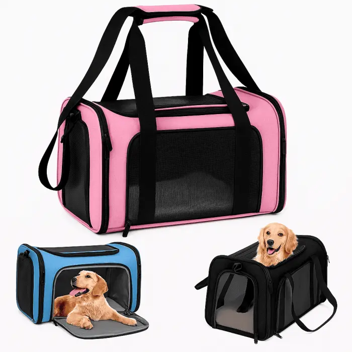 Bolso transportador para mascotas3 modos de aperturaMedidas: 45 x 30 x 30 cmColores rosa, azul y negro. Se envía surtido.