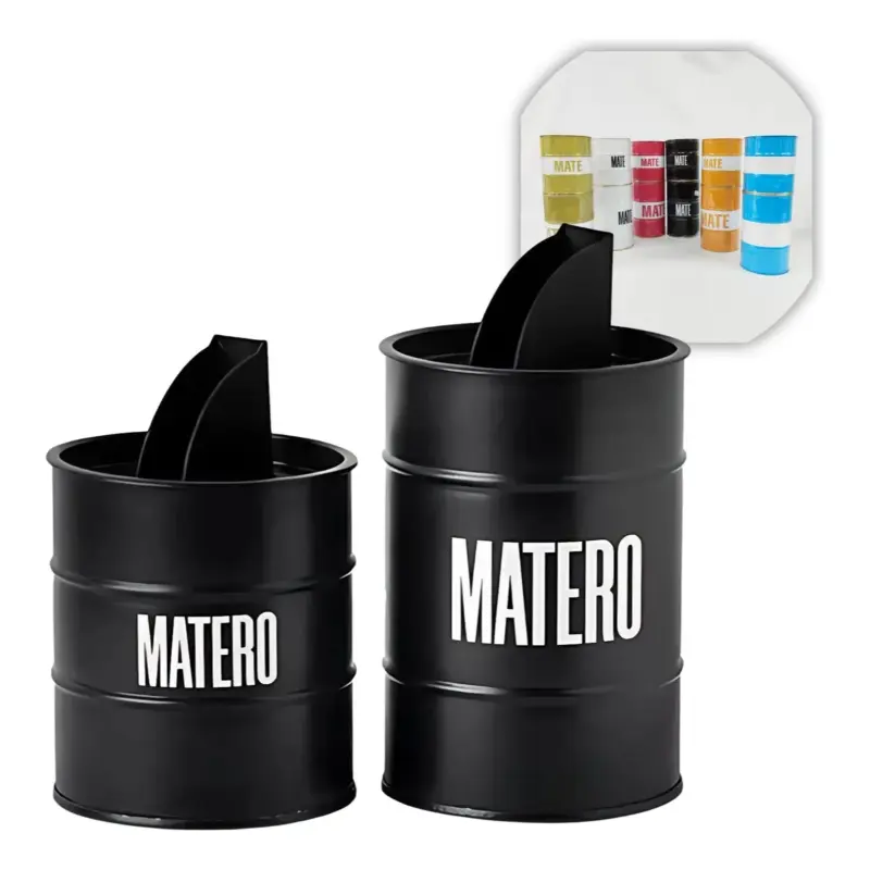 Hermoso y moderno kit Yerbero y azucarero para el mate. Diseño urbano y llamativo de barril de lata en versión mini. Todos quieren llevar su kit a todos lados y más si son tan llamativos y modernos como estos. Es de material resistente que mantiene fresca la yerba. Color mate el cual lo hace más resaltante y lindo